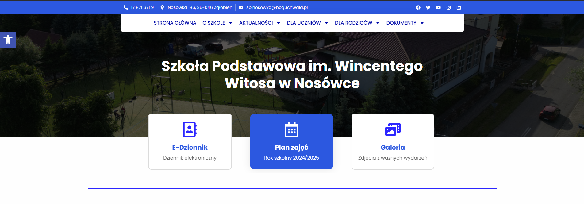 Strona Szkoły Podstawowej w Nosówce. Umożliwia szybkie i łatwe dodawanie treści tj. ogłoszeń, aktualności, galerii, planów zajęć.
