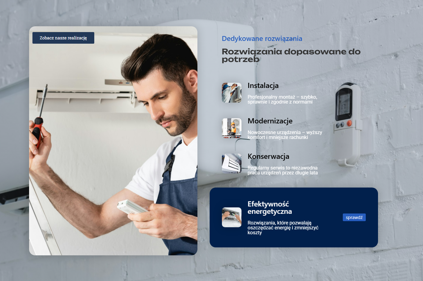 Strona prezentuje ofertę montażu i modernizacji klimatyzatorów oraz pomp ciepła, podkreślając nowoczesne i energooszczędne rozwiązania. Przejrzysty układ ułatwia szybkie zapoznanie się z usługami, a formularz kontaktowy pozwala wygodnie zgłosić zapytanie
